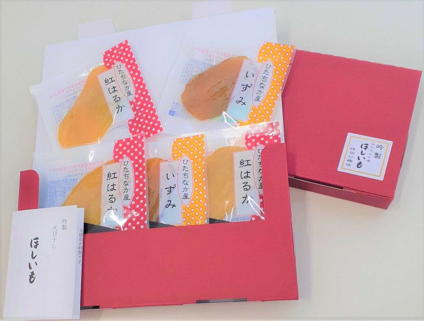 紅はるかといずみの2種類入りで1袋20gが5袋に入ってます。薄さ2㎝のスマートな箱入りでちょっとした手みやげにもおススメです。
